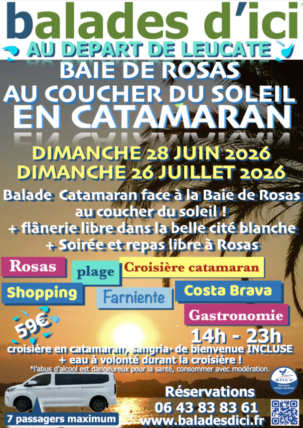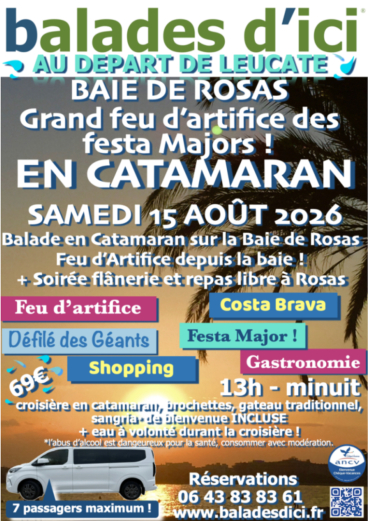 Au départ de Leucate, une journée pleine de découverte, de patrimoine, de cultures locales, de farniente ... nous vous proposons, après votre flânerie au coeur de Rosas la Blanche, de monter à bord d'un Catamaran sur la très belle baie de Rosas, pour accompagner un coucher de soleil d'été !