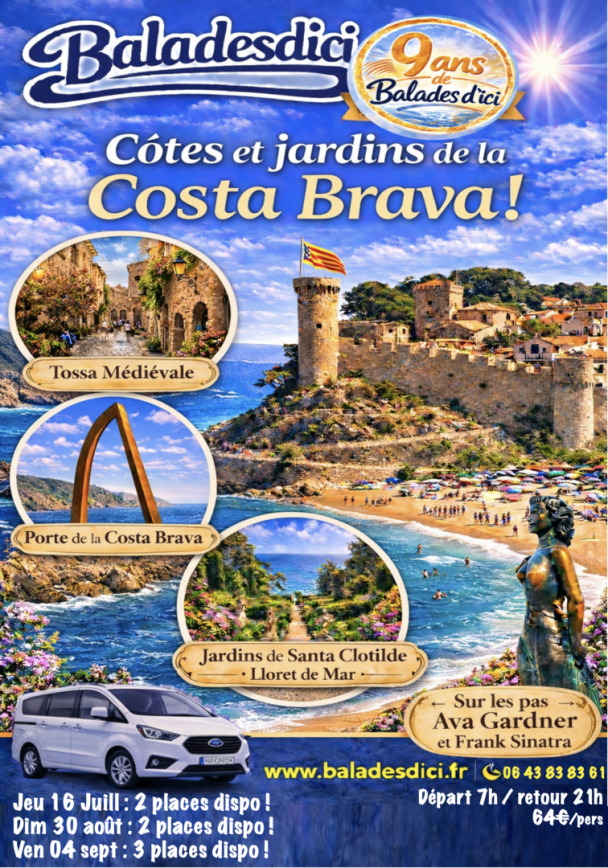 Imaginez-vous ! sous une grande arche de métal vous indiquant que vous êtes sous la porte de la COSTA BRAVA ! Avec Balades d'ici découvrez cette porte qui vous ouvre un monde de bleus, de turquoises, de parfums, de senteurs, de rencontres riches ! Histoire et culture vous donnent ici rdv entre montagnes et dame Méditerranée !