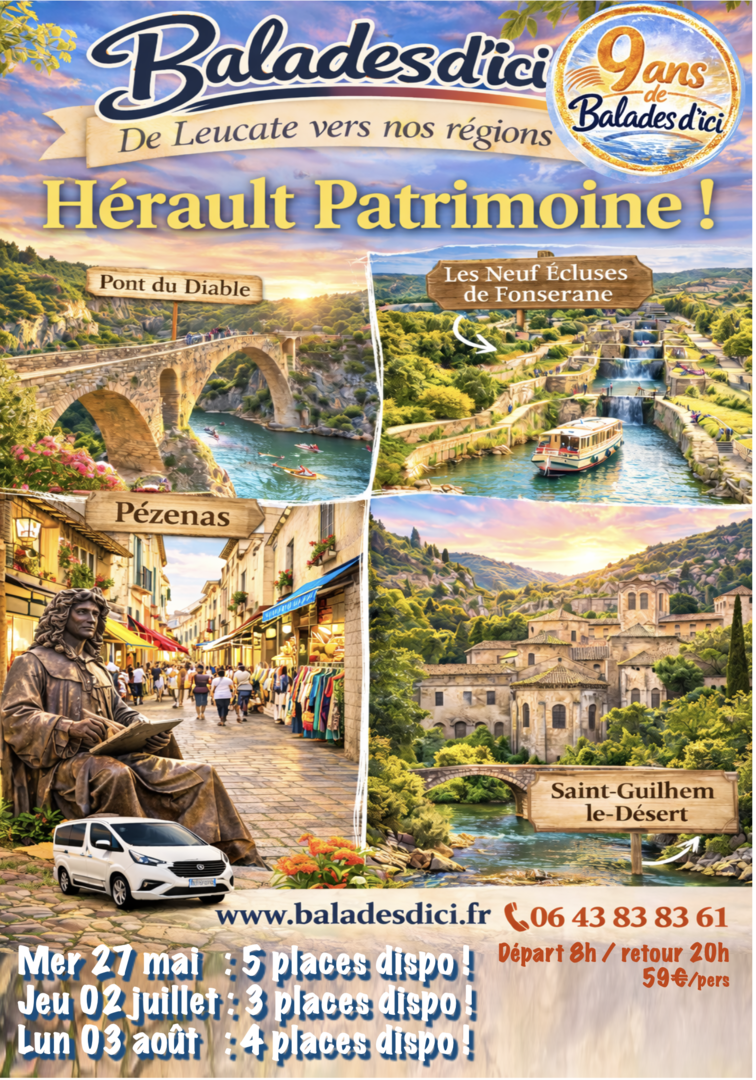 journée pleine de découverte, de patrimoine, de cultures locales ... HERAULT PATRIMOINE avec Balades d'ici c'est une journée pas comme les autres, de Leucate à Saint-Guilhem-le-Désert, immertion au coeur d'un village atypique, paysages et curiosités, l'imposante Abbaye de Gellone ... Les somptueuses Gorges de l'Herault ... le Pont du Diable .. journée plurielle et solaire ! ....